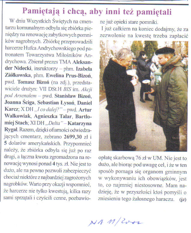 Pieniądze zostały wpłacone w dniu 5-go listopada 2002 roku na konto Towarzystwa w Banku Spółdzielczym w Andrychowie i zostaną wykorzystana zgodnie z celem zbiórki, na remont pomników na Cmentarzu Komunalnym w Andrychowie.