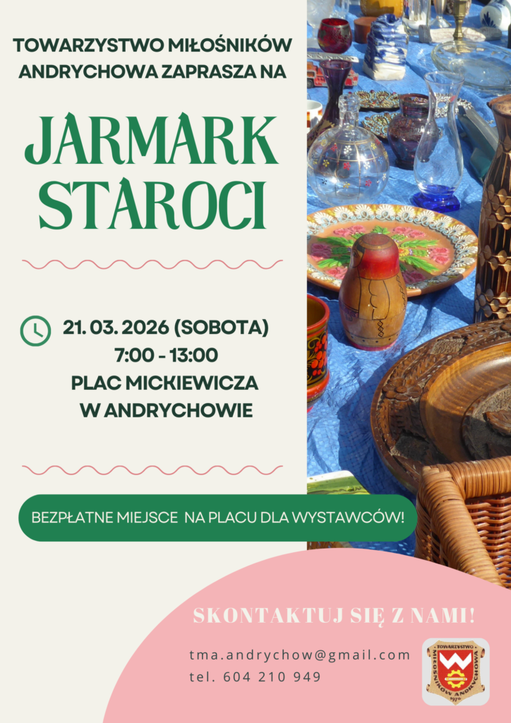Serdecznie zapraszamy do udziału w pierwszym w tym roku jarmarku staroci w Andrychowie. Wydarzenie odbędzie się w sobotę 21 marca w godzinach 7:00-13:00, trydycyjnie już na Placu Mickiewicza.